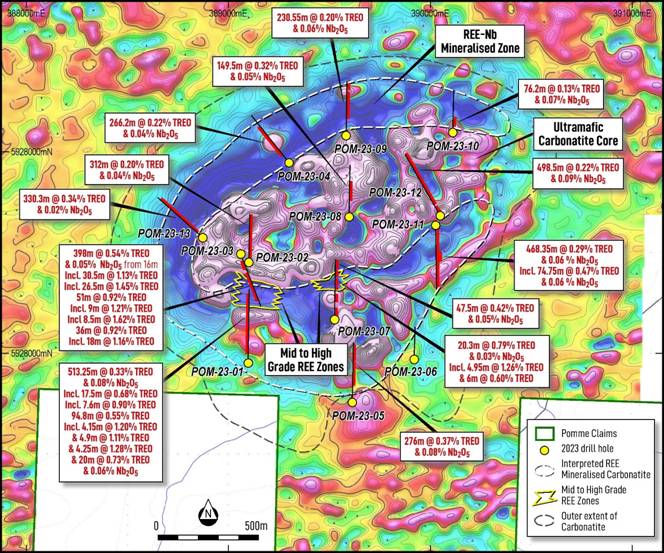 - Drillhole POM-23-01: 513m @ 0.33% TREO & 0.08% Nb2O5 from 32m, including: