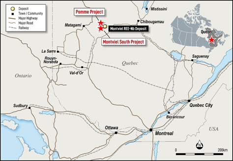 New Frontier Minerals Ltd (LSE and ASX: NFM) is pleased to announce that it has entered into a binding option and earn-in agreement providing NFM with the right to acquire a majority (90%) interest in the Pomme REE Project from Australian-listed company Metallium (ASX: MTM), which is located approximately 500 km northwest of Montréal in Québec around 100 km from the service town of Lebel-sur-Quévillon. The Pomme Project consists of 43 mineral claims, covering 2,400 ha. NFM holds the exclusive and binding option to acquire 90% of the Pomme REE-Nb project.