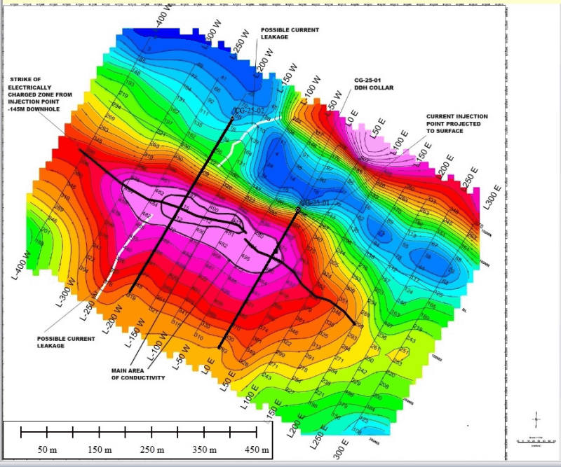 Hole CG-25-02 is collared about 200m to the northwest to intersect the same zone at about 200-meter vertical depth.