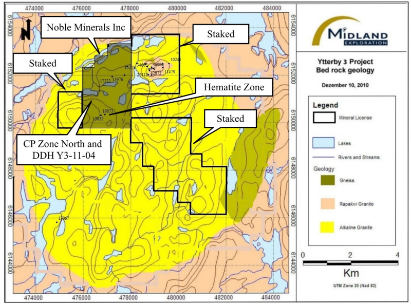 On the property recently staked by Noble, six grab samples greater than 0.5% TREO were located by Midland. They ranged from 1.40 to 3.02% TREO with:
