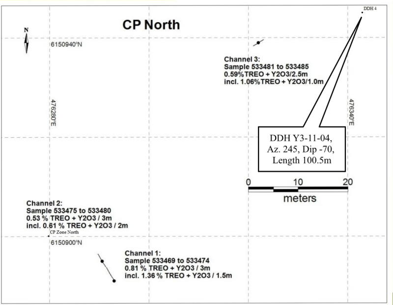 Drill hole Y3-11-04 was aimed at the CP North Showing. The hole intersected a grey-pink coarse grained alkaline granite with 2-3% disseminated iron oxides and amphiboles. A total of 29 samples varying in length from 1 to 1.5 meter were collected. All collected samples returned anomalous TREO + Y2O352 values averaging 0.14% TREO + Y2O3 ranging from 0.11 to 0.19% TREO + Y2O3. The best assay results returned 0.13% TREO + Y2O3 over 7.5m from 25.0 to 32.5 meters, 0.14% TREO + Y2O3 over 12.0 m from 38.0 to 50.0 meters and 0.16% TREO + Y2O3 over 7.5 m from 64.0 to 71.5m.