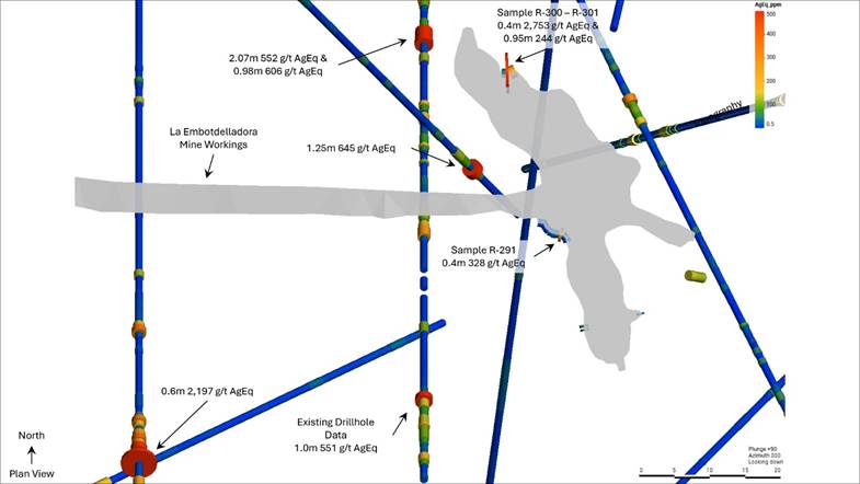 A total of 16 channel samples were collected from the historic La Embotelladora mine workings, showing mineralization localized in ENE and NNE structural zones. Sample R-300 returned 2,753 grams per tonne (g/t) silver equivalent (AgEq) over 0.4 metres (m) representing the NNE trending zone. Sample R-291 returned 328 g/t AgEq over 0.4m representing the ENE structural zone (Table 1). These data combined with existing drilling results are aiding in the Company’s ongoing strategy of transitioning La Joya from an open pit to an underground project by confirming high grade mineralization localization in a network of prospective structures. Ongoing geologic modeling will focus on validating this thesis through re-focused exploration planning.