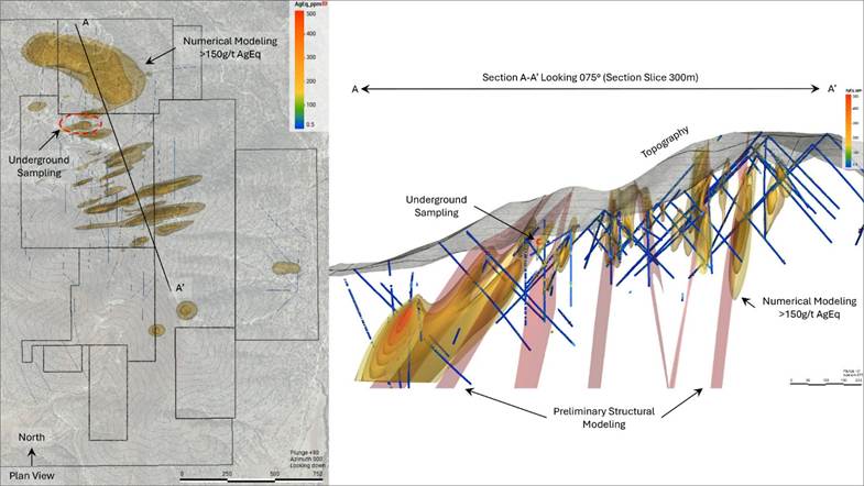 Silver Dollar has also completed preliminary numerical modeling of existing drillhole assay data to identify additional high-grade mineralization. Numerical models were trended using preliminary vein modeling, which focused on a series of emerging E-W trends. Ongoing geologic modeling will incorporate other local trends, including a NNE structural trend, and the impact of stratigraphic-structural intersections on plunging mineral trends.