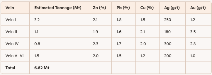 The historical estimate reports a total of approximately 6.66 million tonnes of mineralized material across multiple veins (Filons I, II, II bis, III, IV, and associated structures). The report indicates average grades across the total tonnage in the range of ~2–5% Zn, ~1–3% Pb, and ~0.5–1% Cu, with silver and gold present in trace to moderate concentrations. Certain localized zones within individual veins were reported with significantly higher grades (Zn > 10%, Pb > 7%, Cu > 2%, Ag > 100 ppm, Au > 4 ppm), but these are not representative of the overall historical estimate.